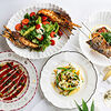 Блины с морепродуктами, крабом и красной икрой