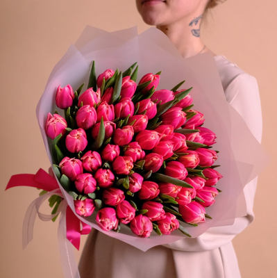 - Букет из ярко-розовых пионовидных тюльпанов премиум