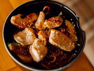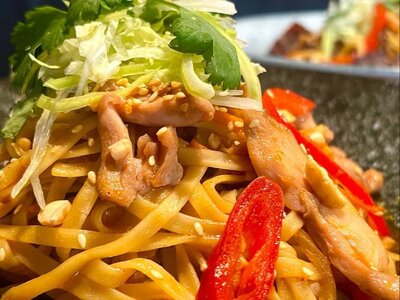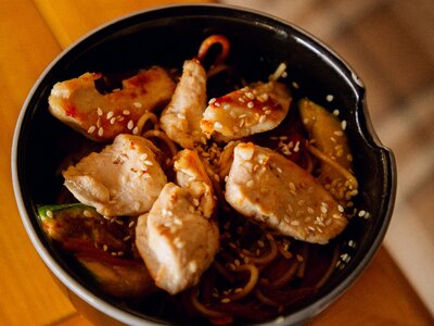 На компаниюParty wok курица в кисло-сладком соусе с лапшой соба1,8 кг