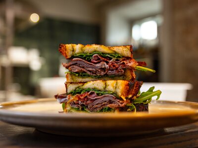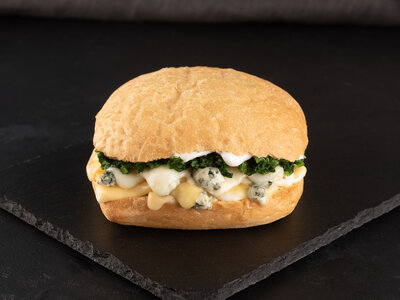 Сэндвич с говядиной, беконом, песто и копчёным сыром