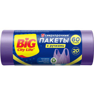 Пакеты д/мусора Big City Life Сверхпрочные лилов с ручками (hd 60*85см 60л) 20шт/1уп