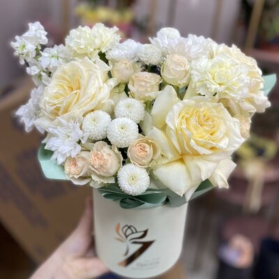 Цветы в цилиндре ( роза одноголовая и кустовая, маттиола, хризантема