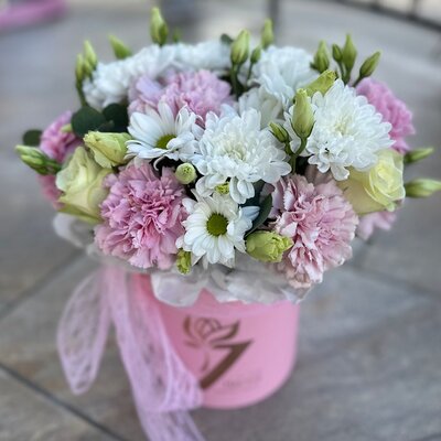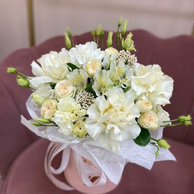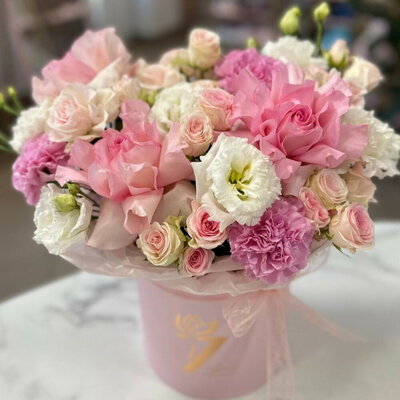 Цветы в коробке (эустома, диантус, французская роза, кустовая роза)