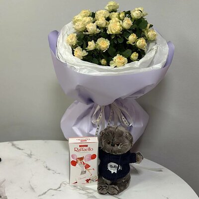 Букет №2 из кустовых роз с мягкой игрушкой и конфетами