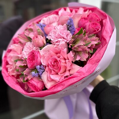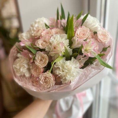 Букет сборный из кустовых роз, диантусов и альстромерий