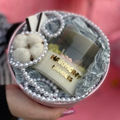 Подарочный бокс(свеча, спички, конфеты, открытка, сухоцветы)