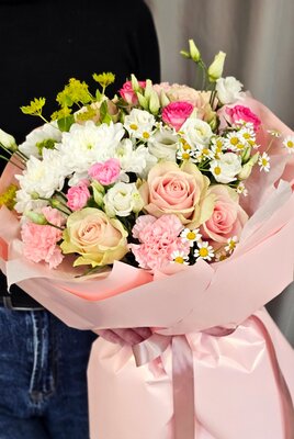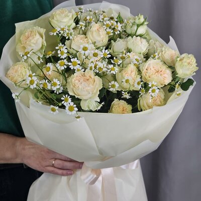 Букет из кустовых пионовидных роз и матрикарии