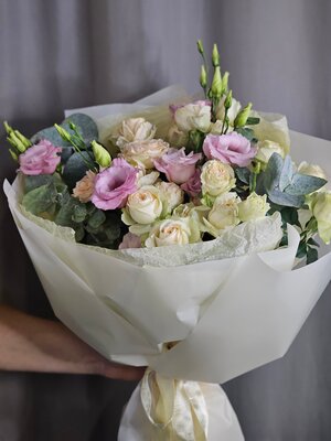 Букет из нежных роз,эустом и эвкалипта