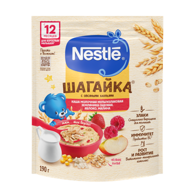- Каша молочная Nestle Шагайка мультизлаковая с земляникой, яблоком и малиной 190г190 г